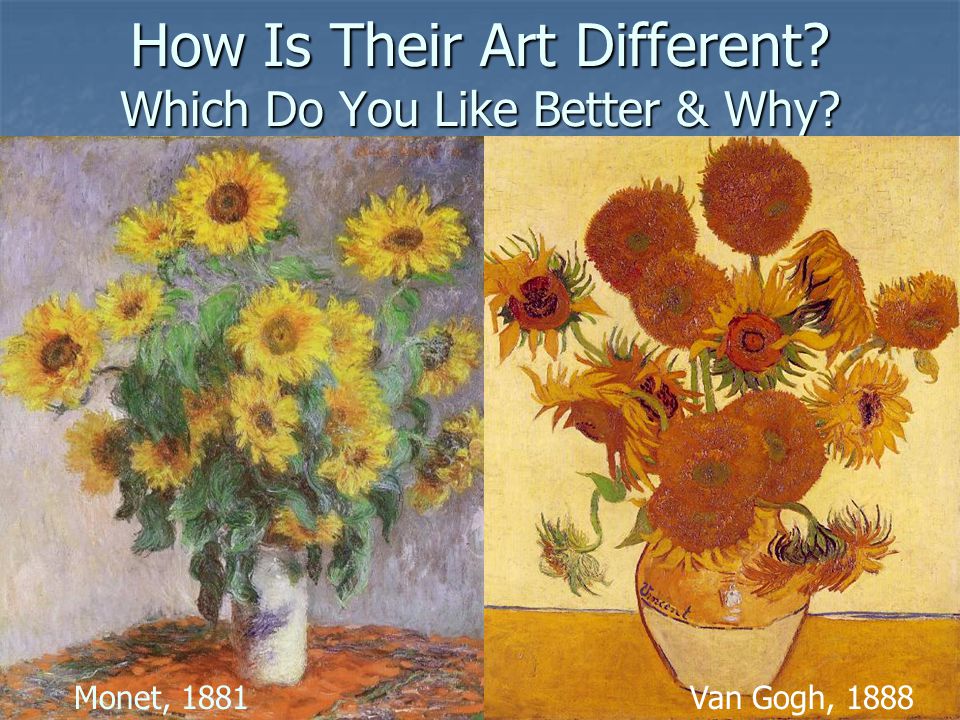 Claude monet and vincent van gogh were two prominent, influential painters that contributed and shaped their respective artistic periods: Claude monet's impact on vincent van gogh. Van gogh's paintings in his earlier years was based on a more muted dutch inspired palette and was in striking contrast to his later works where bold colors were used as a expression of emotion. Both of these styles share similar characteristics and have a focal point around color, but they speak to the viewer in different ways. 29/12/2017 · in closing, monet and van gogh are very alike in the sense that they both enjoyed painting outdoor landscapes, but they are very different in the way they capture the scenes. The art of monet is actually what van gogh realize the beauty in impressionism.